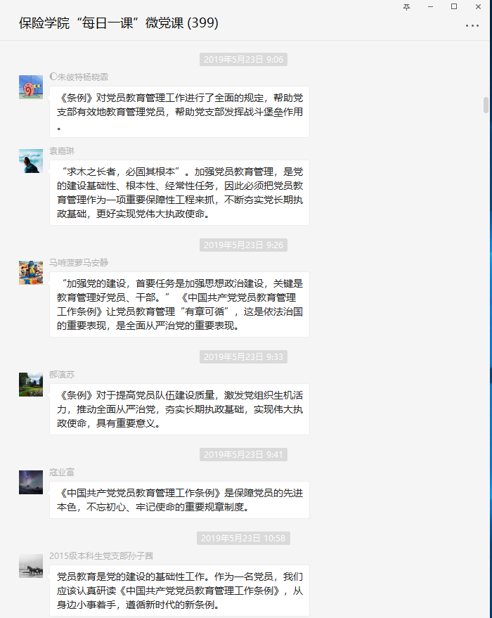 2017级保险研究生周悦谈到:党员教育管理是细水长流的工作,必须抓在经常、严在日常。每名党员都要按照党章要求和《条例》规定,接受党组织的教育管理,充分发挥先锋模范作用,既把平凡岗位当作“磨刀石”,又把重大任务当作“试金石”,不忘初心、牢记使命,争当时代先锋。