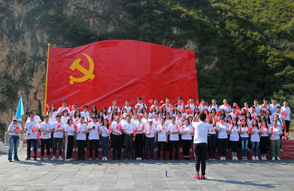 一面被称为“全国最大党旗”依山就势飘展在纪念馆对面的山梁上,与“没有共产党就没有新中国”纪念馆遥相呼应。全体党员在党旗广场的这面党旗下合影,共同呼喊出对祖国、对中财大的祝福。随后党员们在党旗下摆出“70”的字样,共祝新中国70岁生日快乐,祝中财大70岁生日快乐!