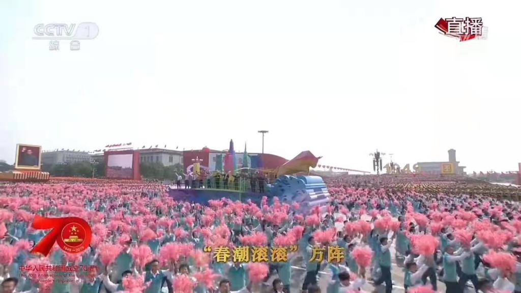 当游行方阵走上长安街,走过天安门,激动荣光之情荡漾在每一个人心中。我们身着节日盛装,手持鲜花彩带,伴随着《在希望的田野上》优美旋律,簇拥着代表着改革开放精神的彩车,热情洋溢的走过天安门广场,接受新中国和人民的检阅。