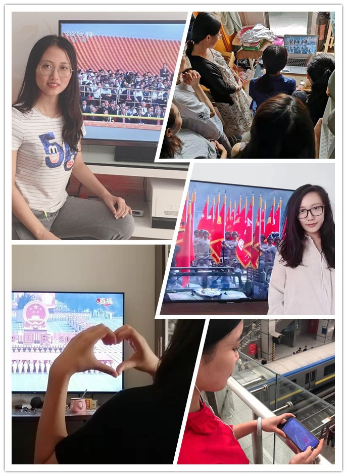 党支部委员雍婷婷:非常荣幸的参加了新中国七十华诞的国庆群众游行的方阵,见证了这场气势恢宏的盛大仪式!准备过程中,踮起脚尖扭歪了脖子挤在人群中看直播开始画面,当习近平总书记说到阅兵开始时,我们以雷鸣般的掌声欢呼着;当3面国旗和20架飞机组成的70字样从头顶飞过,我们跳跃着,呐喊着向飞机挥动着我们手中的花束;在群众游行开始后,百灵鸟般的声音唱起“今天是你的生日,我的祖国”时,我热泪盈眶,生怕眼泪模糊了我的视线,这一刻,终于要来了。通过天安门、接受祖国和人民检阅的那一刻,激动的心情无以言表,用自己最大的力气去跳跃,去呐喊:祖国万岁!