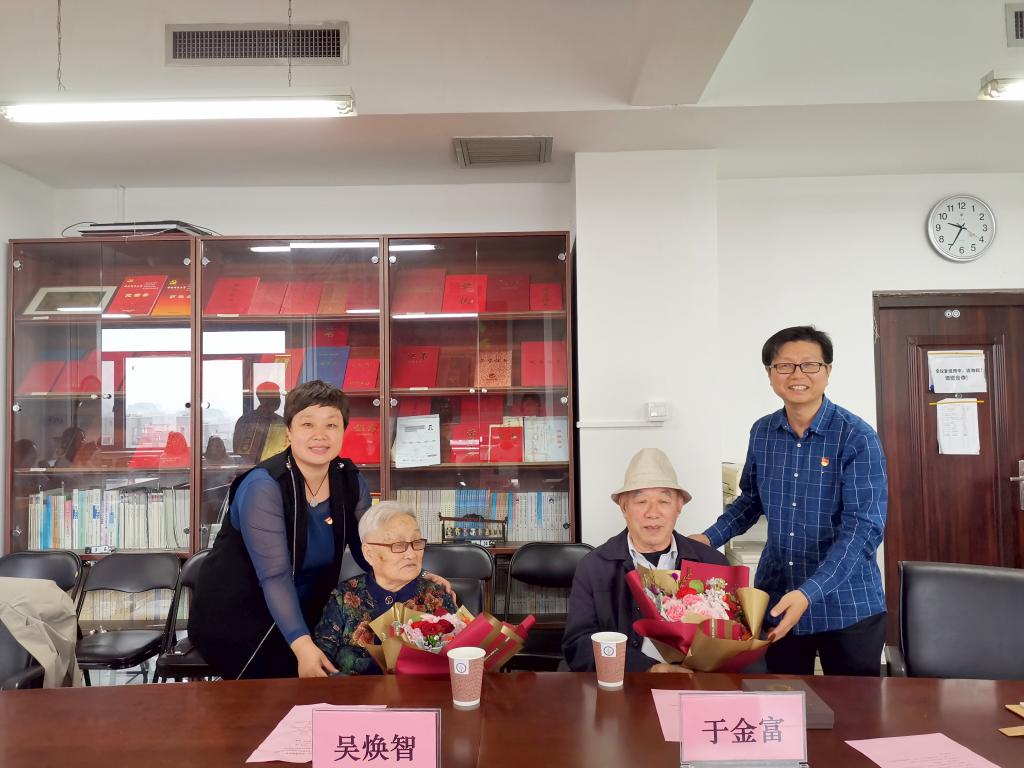 新葡萄8883官网AMG官网院长李晓林、党委书记王颖、党委副书记张楠楠分别向两位老师的交流分享表示感谢,通过聆听前辈们的故事,也深受感染和感动,两位老师对教育事业做出突出贡献,也对青年党员充满了关心和厚望。希望在座的青年党员们不忘两位老师的嘱托,牢记自己身上的使命和担当,常怀爱国情,实现报国志,为祖国和学校的发展贡献力量。李晓林老师、王颖老师代表新葡萄8883官网AMG官网党委为两位纪念章获得者献上鲜花,再次表达新葡萄8883官网AMG官网全体师生对吴焕智老师、于金富老师的深切感谢和由衷的祝福。
