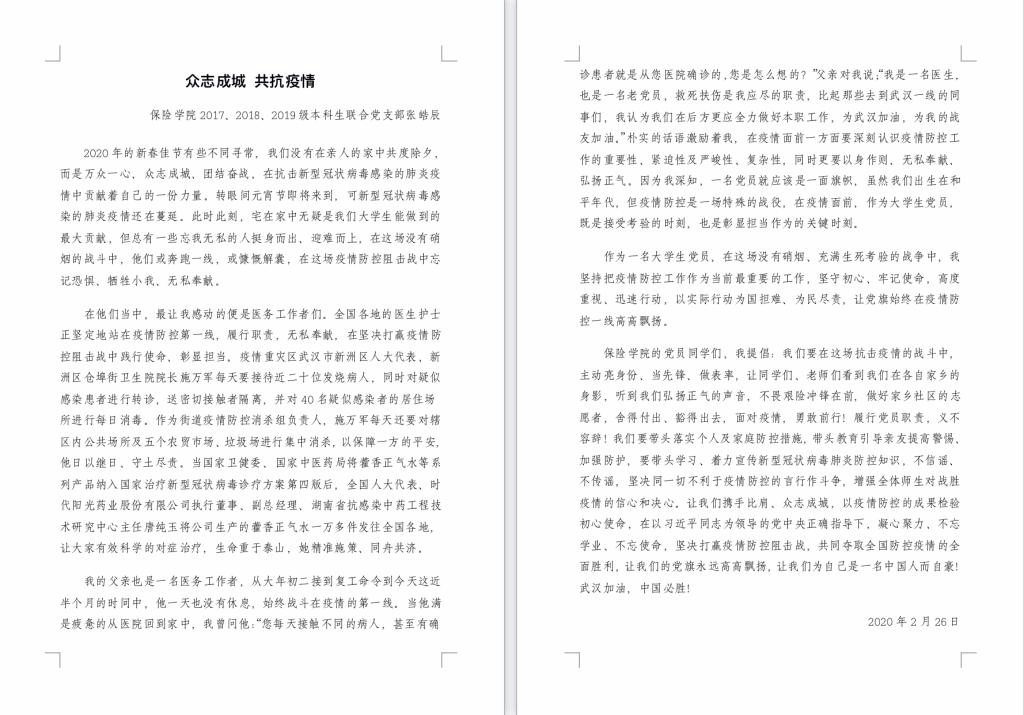 党员们结合自身兴趣爱好和专业特长,以“万众一心,抗击疫情”为主题,以文章等为载体进行作品创作,致敬抗“疫”一线人员,表达对全民共同打赢这场疫情阻击战的美好祝福,传递爱党爱国情怀和战“疫”必胜的信念,积极弘扬社会正能量。