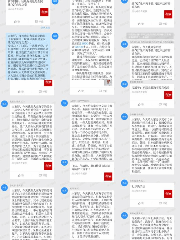 新葡萄8883官网AMG官网2017、2018、2019级本科生联合党支部开展“每日一学”活动,全体党员利用学习强国学习平台,23天的知识普及,23位党员轮流分享党和政府有关新型冠状病毒疫情防控的政策措施、新型冠状病毒感染防护知识等疫情防控相关知识,参与人次达390余次,发言字数32000余字。或是学习七步洗手法科学保卫健康,或是科普解读新冠肺炎康复者捐献恢复期血浆招募动员通知,亦或是分享新冠病毒传播途径促进有效预防,党员们每天针对不同话题积极发表自己的见解,总结自己的收获,并以实际行动向身边的亲朋好友进行宣传,做科学防疫知识普及的先锋。