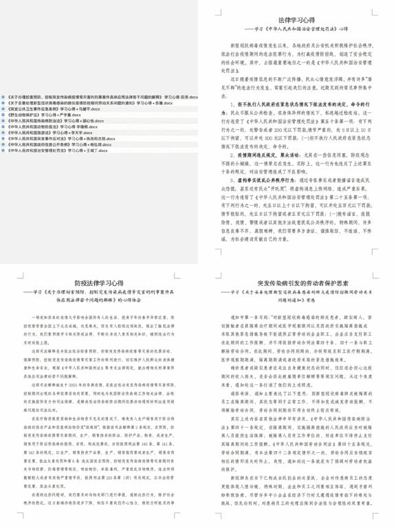 为更好地增强法治意识,筑牢思想行为防线,以身作则引导身边广大群众知法懂法、遵纪守法,党员们认真学习《中华人民共和国传染病防治法》、《中华人民共和国突发事件应对法》、《中华人民共和国野生动物保护法》、《中华人民共和国动物防疫法》、《中华人民共和国传染病防治法》、《中华人民共和国治安管理处罚法》、《突发公共卫生事件应急条例》等重要法律、法规;同时,结合现实中的反面案例,理论学习与实际相结合,知法懂法,以违法乱纪为戒,坚决按照疫情防控的有关要求,依法行动、依法行事。