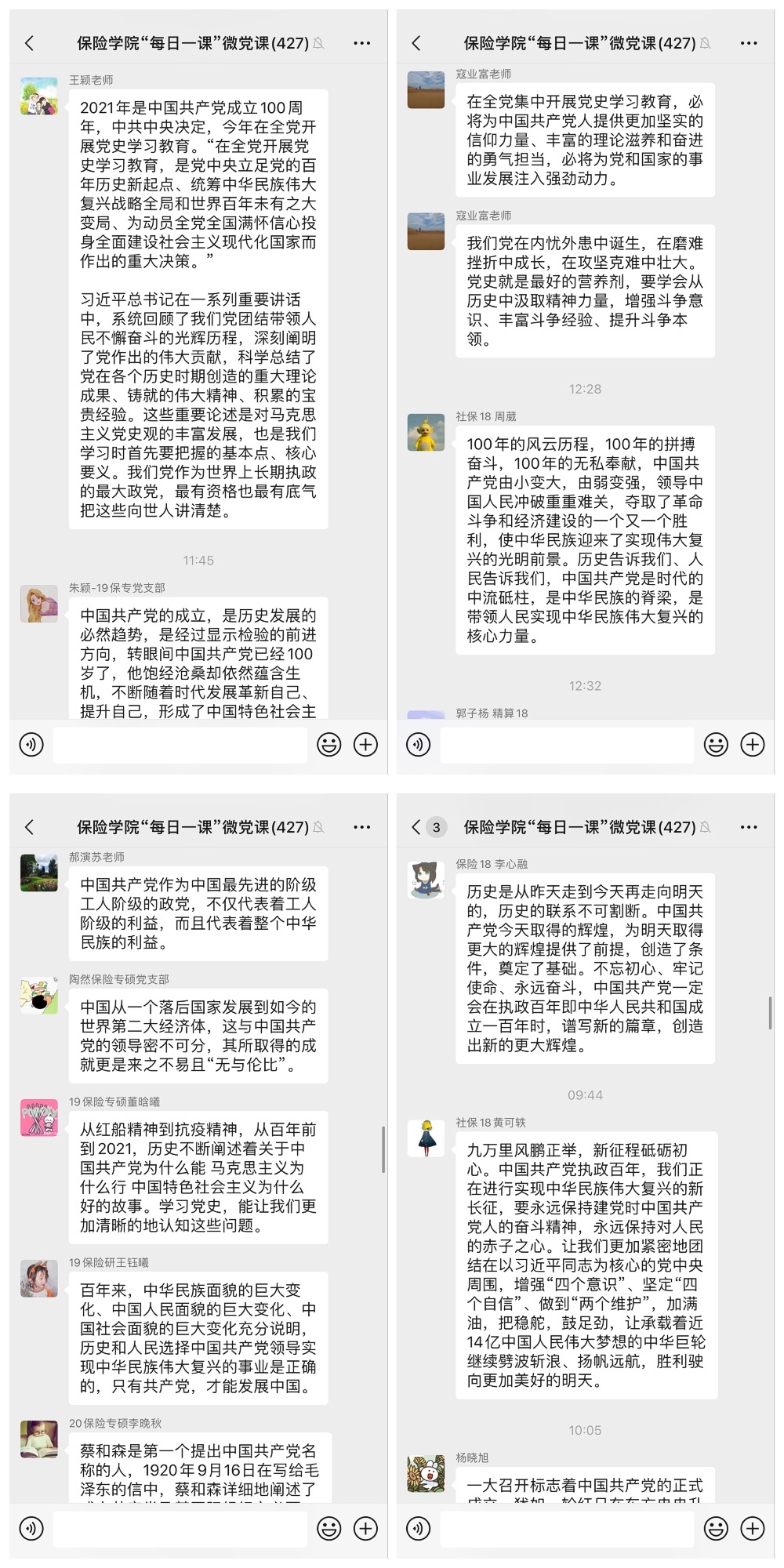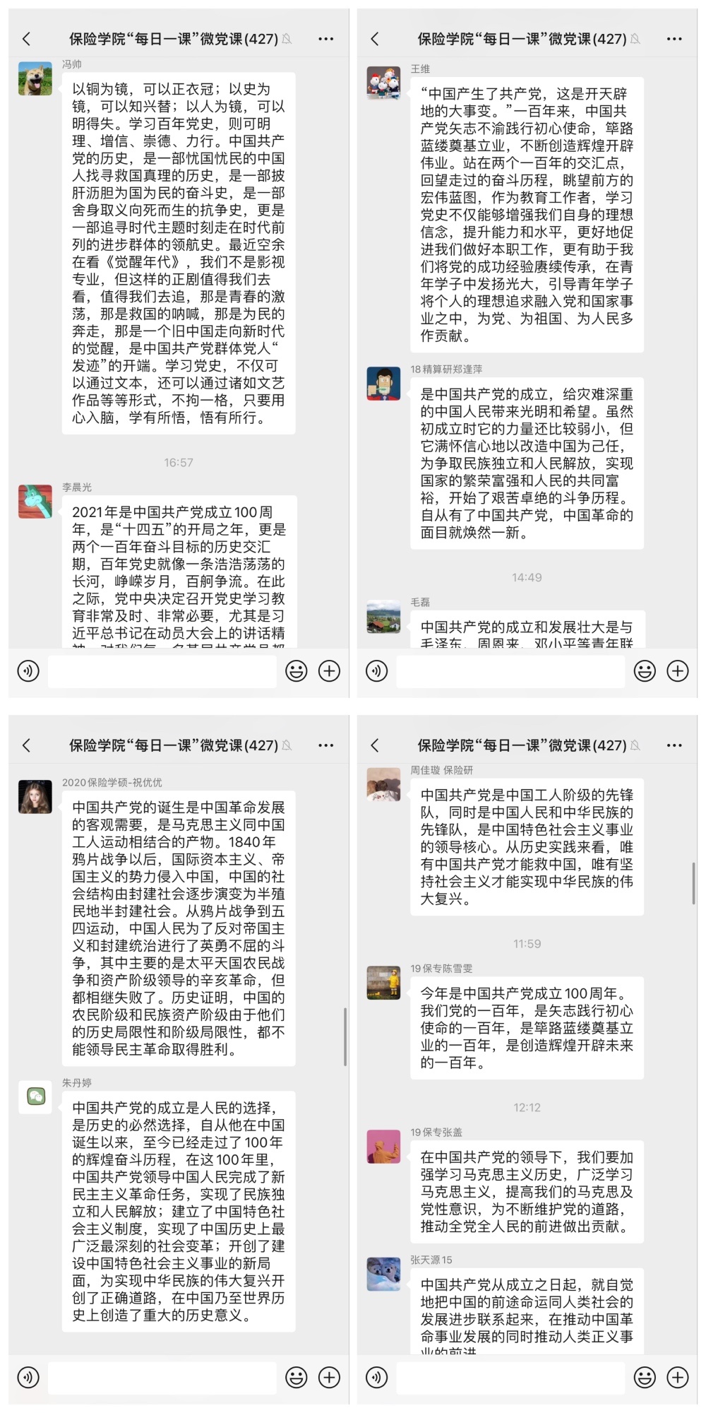新葡萄8883官网AMG官网党委创新党史学习教育方式,充分利用“每日一课”微党课平台,将学习教育工作融入日常、抓在经常,采取多种方式,分层面、全覆盖开展学习。从今天开始,新葡萄8883官网AMG官网党委全面开展“党史天天学”学习活动,精心选取学习强国和共产党员网等发布的权威党史学习资料,以党史为重点,覆盖新中国史、改革开放史和社会主义发展史等,利用“每日一课”微党课平台,每日进行专题党课宣讲,全体师生党员根据推送内容分享感悟,交流心得,有效提升学习兴趣,使得党史学习入脑入心。