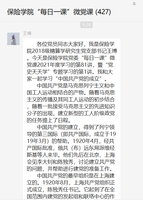 今天,新葡萄8883官网AMG官网2018级精算学研究生党支部书记王博进行“党史天天学”专题学习的第1讲宣讲,宣讲主题为“中国共产党的成立”。他讲到,中国共产党的成立,适应了近代以来社会进步和革命发展的客观要求,是开天辟地的大事变。正是这个党,给灾难深重的中国人民带来光明和希望。虽然这时它的力量还很弱小,但它满怀信心地以改造中国为己任,为争取民族独立和人民解放,实现国家的繁荣富强和人民的共同富裕,开始了艰苦卓绝的斗争历程。自从有了中国共产党,中国革命的面目就焕然一新。