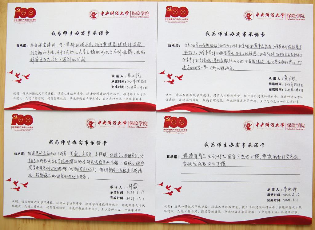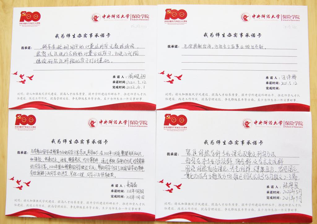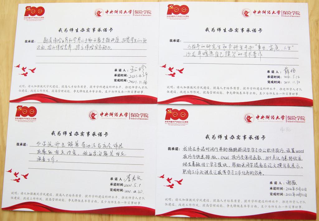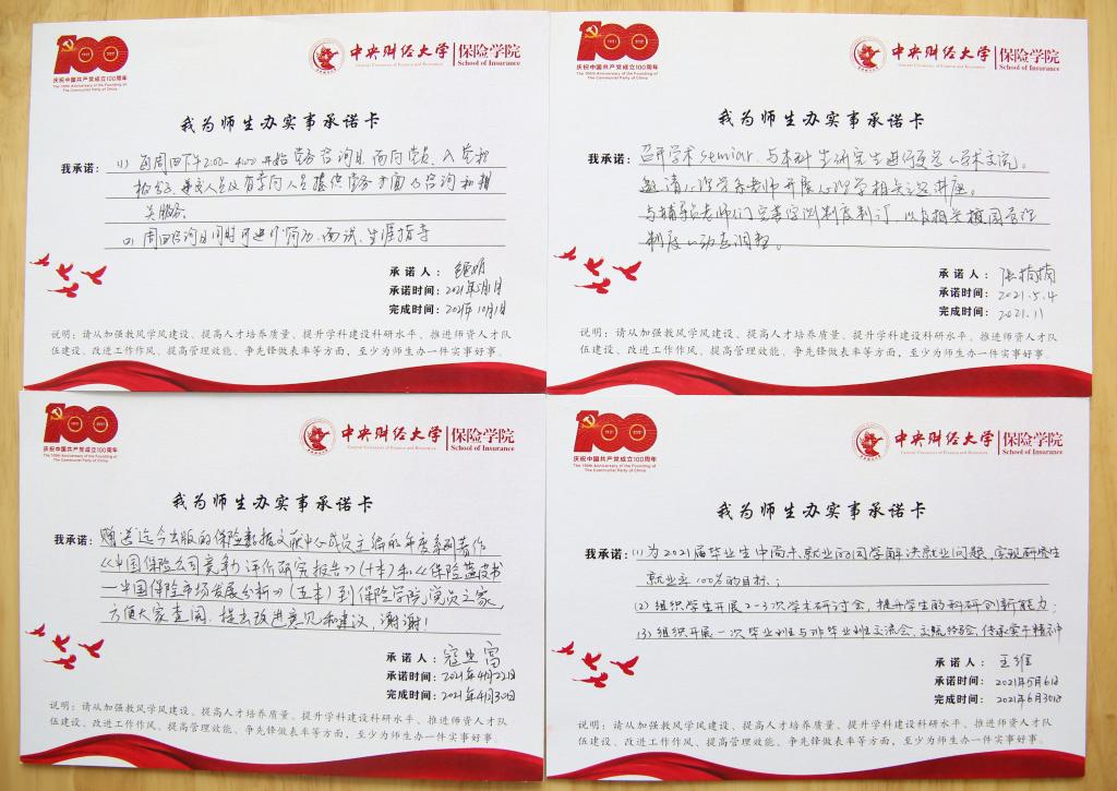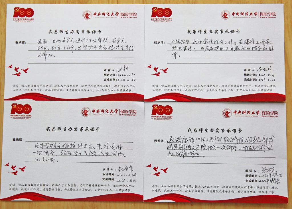 学院的会议桌上,铺满了师生交来的263份承诺卡,内容涉及发展所需、基层所盼、民生所向的方方面面。有教师写道:“在本学期邀请校外专家来校进行一次讲座,鼓励学生了解行业发展趋势”“选取1-2名学生进行结对帮扶,在学习、就业、生活、经济、思想等各个方面提供全方位的帮助”“在媒体上开展招生宣传,为应届毕业生开展就业指导和推介”“为新葡萄8883官网AMG官网党员之家赠送《中国保险公司竞争力评价研究报告》和《保险蓝皮书——中国保险市场发展分析》,方便师生党员查阅”等,从学科背景、日常生活、就业发展、学术研究等多个方面承诺实事,办好实事。有学生党员写道:“对某学业困难的同学进行一对一学业帮扶,帮助其更好完成某某课程的学业修习”“无偿捐献血液,为社会公益事业做贡献”“坚持每周三主动打扫宿舍卫生,带领宿舍同学养成良好生活及卫生习惯”等,从学业帮扶、社会责任、宿舍生活等各方各面发挥学生党员的先锋模范作用。