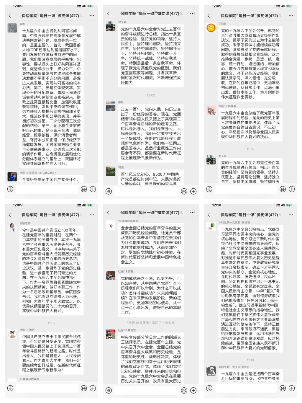 20级保险学硕王露同学谈到,2021年是中国共产党建党100周年,在这一重要历史时刻,召开了党的十九届六中全会,具有重要的历史意义。全会审议通过了《中共中央关于党的百年奋斗重大成就和历史经验的决议》,再次强调要坚持唯物史观和正确党史观。作为学生党员,应当主动学习了解党史,从中总结经验教训、汲取精神力量,并将其应用到日常学习和科研中,肩负起新时代的责任和担当。