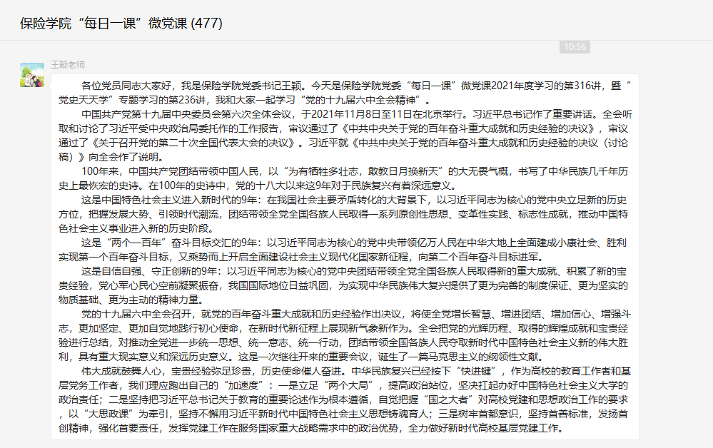 保险系教工党支部书记郑莉莉谈到,十九届六中全会全面总结党的百年奋斗重大成就和历史经验,是郑重的历史性、战略性决策,体现了我们党重视和善于运用历史规律的高度政治自觉,体现了我们党牢记初心使命、继往开来的自信和担当。