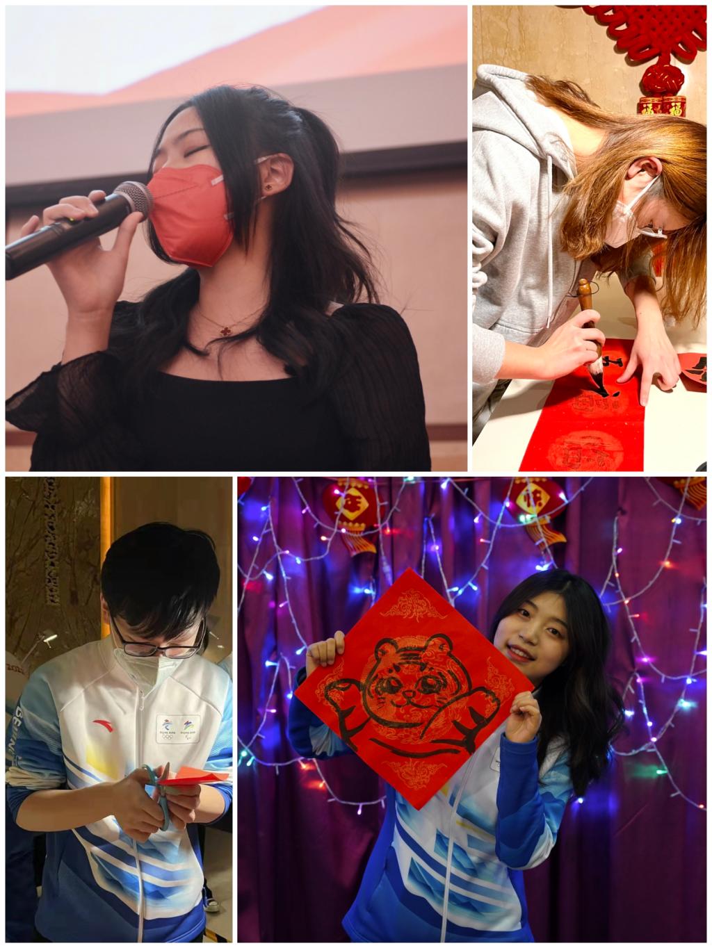 临时党支部成员刘思婕在驻地除夕晚会上演唱《那些你很冒险的梦》,带动春节气氛、获得全场掌声;临时党支部党员秦然、邱治澔、谈昕瑜等同志积极参加写春联、剪窗花、画春福等活动,布置装饰志愿者生活驻地,为大家营造温暖喜庆的生活环境。还有的党员同志在日常生活中,化身知心朋友,为身边的志愿者同学做好心理疏导;化身宣传员,用文字和相机为志愿者记录下难忘的瞬间;化身提醒员,检查小组志愿者的防护服是否穿戴好、手消是否严到位,帮助成员携带暖宝宝等贴心行动。