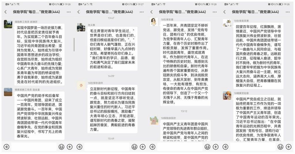 2020级保险博团支部梁涵同学谈到,青年肩负着未来国家的命运,中国共产主义青年团正是我国青年奋发图强的体现。回首过去无数青年英杰为建设新中国义无反顾地牺牲了自己,给我们如今的和平、强大、繁荣创造了条件。历史不会忘记,作为新时代的共青团员的我们更不会忘记。我们将沿着他们的足迹继续鉴定地前进,担当建设祖国、守护祖国、捍卫人民的历史使命。