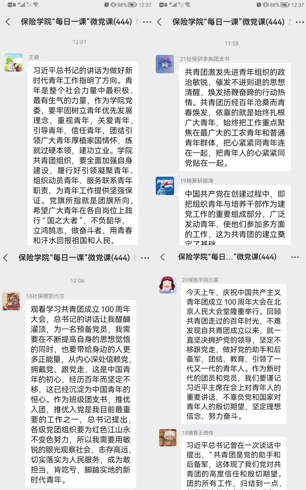 保险学硕20王露谈到,回顾共青团走过的百年时光,不难发现自共青团成立以来,就一直坚决拥护党的领导,坚定不移跟党走,做好党的助手和后备军,团结、教育、引领了一代又一代的青年人。作为新时代的团员和党员,我们要谨记习近平总书记在会上对青年人的重要讲话,不辜负党和国家对青年人的殷切期望,坚定理想信念,努力奋斗。