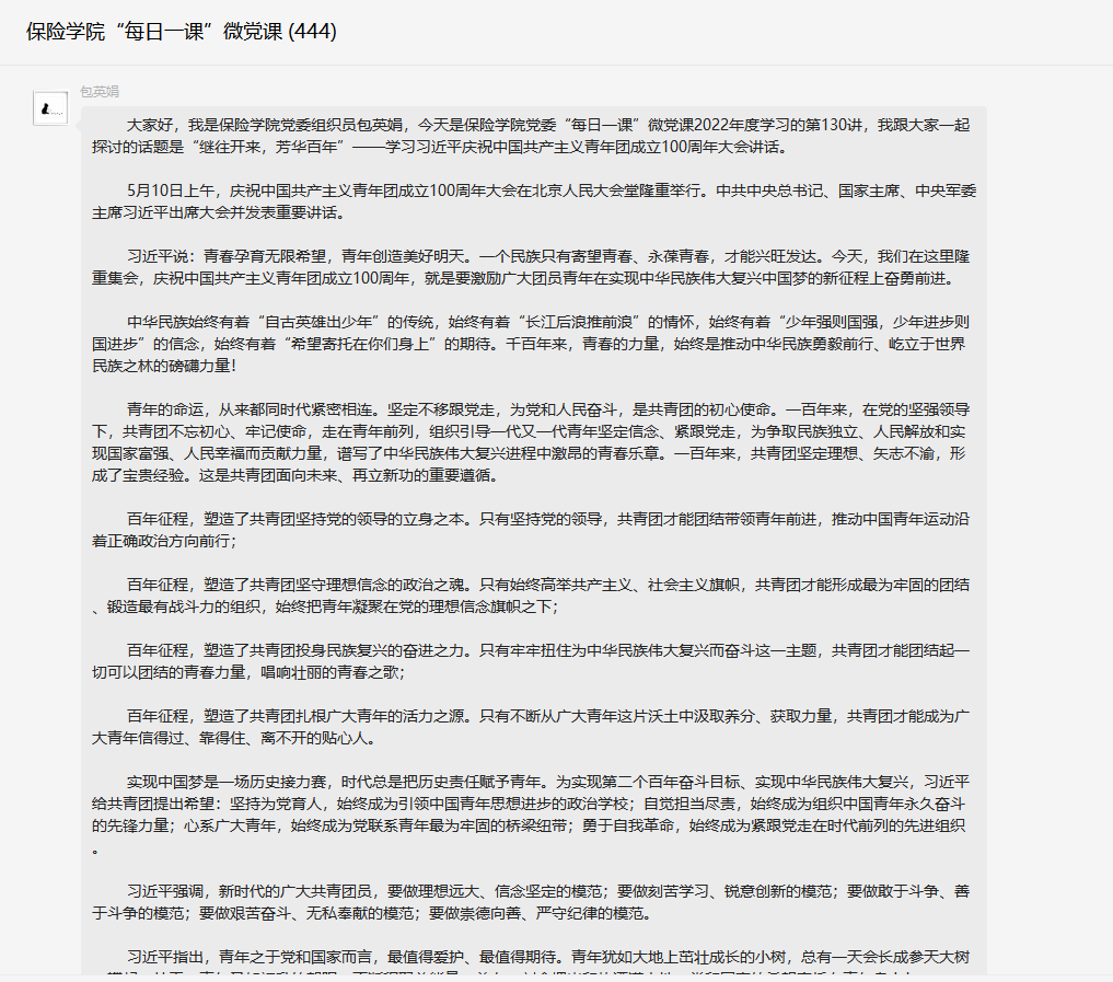 新葡萄8883官网AMG官网党委组织员包英娟在“每日一课”微党课做学习习近平总书记重要讲话主题发言。她讲到,青春孕育无限希望,青年创造美好明天。一个民族只有寄望青春,永葆青春,才能兴旺发达。今天,庆祝中国共产主义青年团成立100周年,就是要激励广大团员青年在实现中华民族伟大复兴的中国梦的新征程上奋勇前进。中华民族始终有着“自古英雄出少年”的传统,始终有着“长江后浪推前浪”的情怀,始终有着“少年强则国强,少年进步则国进步”的信念,始终有着“希望寄托在你们身上”的期待。千百年来,青春的力量,始终是推动中华民族勇毅前行。屹立于世界民族之林的磅礴力量。实现中国梦是一场历史接力赛,时代总是把历史责任赋予青年。为实现第二个百年奋斗目标,实现中华民族伟大复兴,习近平给共青团提出希望;坚持为党育人,始终成为引领中国青年思想进步的政治学校;自觉担当尽责,始终成为组织中国青年永久奋斗的先锋力量;心系广大青年,始终成为党联系青年最为牢固的桥梁纽带;勇于自我革命,始终成为紧跟党走在时代前列的先进组织。