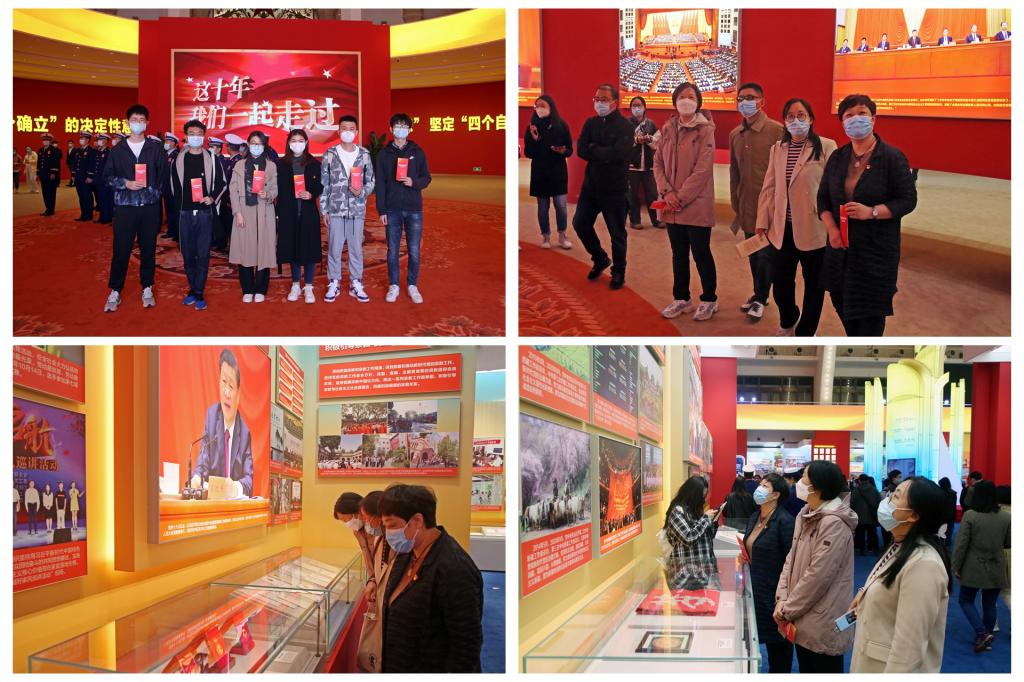 该展览围绕“奋进新时代”这一主题,以党的十八大以来以习近平同志为核心的党中央治国理政为主线,聚焦新时代十年党和国家事业的伟大成就、伟大变革。从脱贫攻坚到抗击疫情,从种业振兴到科技仿生,从深空探测到大国巨舰……师生们走过一个个展区,身临其境般感受着祖国十年间在政治、经济、文化、社会和生态文明建设等领域的巨大变革和非凡成就。一件件实物模型、一段段视频资料、一张张图片图表,无不生动展现了党和国家事业奋进发展的生动故事,让在场的师生倍感振奋、鼓舞,纷纷驻足热议。大家感受到党的坚强领导与人民群众团结一心、干事创业的伟大精神。