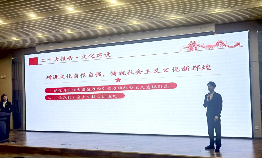 在比赛中,胡庭瑜以《文化的力量激荡奋进崛起的信心》为题,深入解读了习近平总书记对坚守文化自信、重视文化建设的深刻阐述和重要指示,充分结合新时代十年来我国在国际文化传播和文化建设领域取得的辉煌成就,向广大师生分享了对于党的二十大报告中文化建设相关内容的理解和领悟,提出必须夯实文化自信自强的四个立足点,推进文化自信自强。