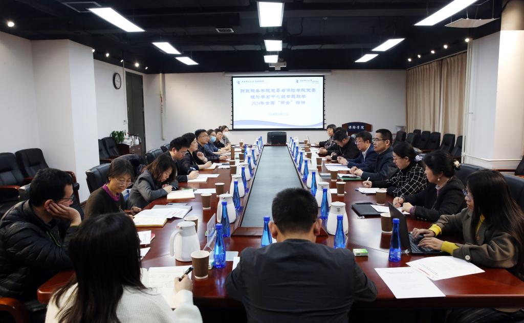 财政税务学院肖鹏书记谈到,在2024年全国两会期间,关于财政预算、金融保险、教育等方面的话题引起了社会的广泛关注和热烈讨论,学习领会全国两会精神对学院事业发展具有重要意义。他指出,此次会议是两院党委理论学习中心组第二次专题联学两会精神,有助于进一步增强理论学习的深度和广度,也希望未来两院能继续延续专题联学的形式,形成良好的理论学习品牌活动。