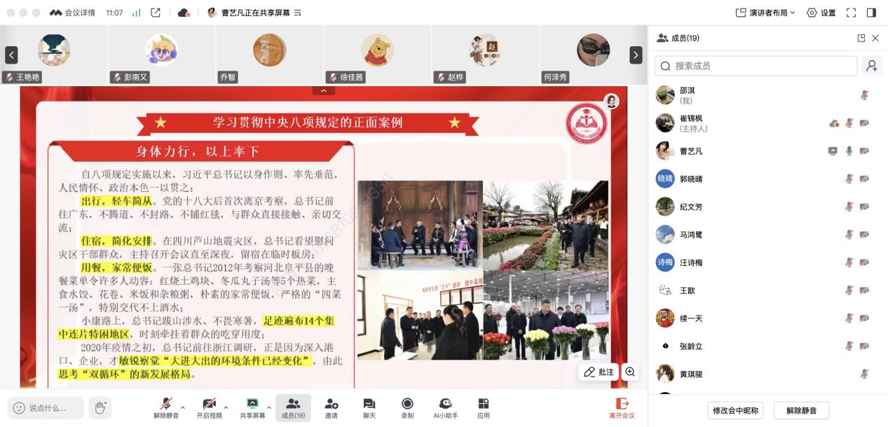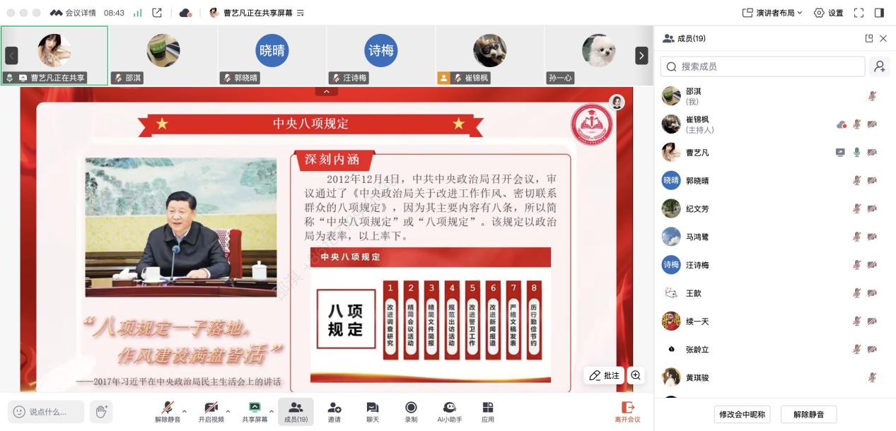 2025年5月13日,新葡萄8883官网AMG官网博士生党支部举办“学八项规定精神,树清风正气标杆”线上专题学习会,特邀校研究生宣讲团成员曹艺凡担任主讲嘉宾,支部全体党员共20余人参与学习。活动旨在通过青年视角的宣讲,深化党员对中央八项规定精神的理解,推动作风建设与学术实践深度融合。