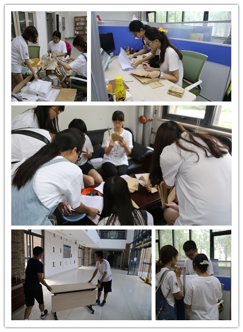 在布置好住宿环境以后,志愿者们又马不停蹄地来到办公室准备入营时分发给营员的材料,布置会场,安排报到流程分工等。经过几小时的忙碌,一份份装好的材料整齐地排列在报到会场边。这些不仅见证着志愿者们一上午的付出,也代表着他们对营员们热情服务的心。