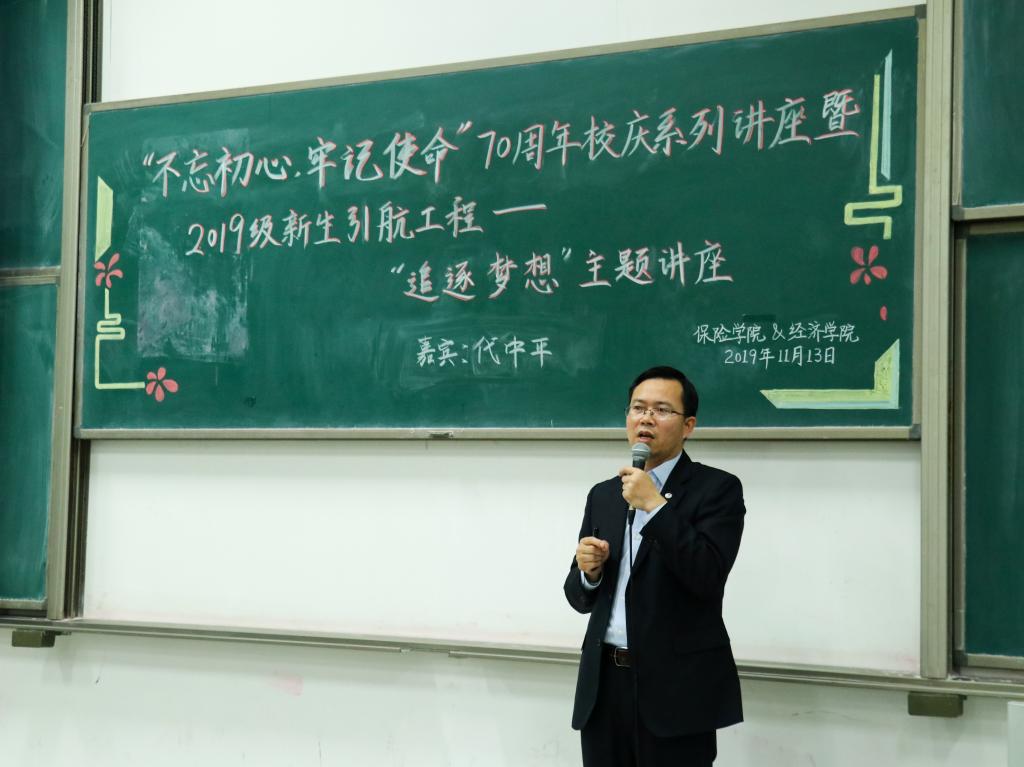 七十春秋写华章,龙马奋进起新航。为响应学校“不忘初心、牢记使命”主题教育的号召,新葡萄8883官网AMG官网与特别邀请到国投财务有限公司副总经理、国投保险经纪有限公司总经理、新葡萄8883官网AMG官网校外辅导员代中平为2019级新生开展“追逐梦想”主题讲座,旨在用梦想的力量指引同学们明晰目标、不忘初心,同时积极探索未来道路,不枉四年学习时光。