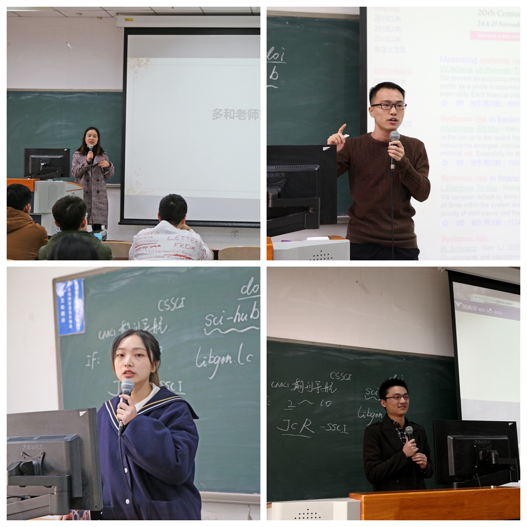 首先,四位国奖得主分别分享了他们在学习、科研等方面的经验。2017精算研冯燕从“加强交流”、“多读书,多学习”、“着手去做”、“常怀感恩之心,诚实做人,踏实做事”四个方面分享了自己的经历,为我们传递了学习经验,并从生活上对学弟学妹予以指引。她表示,寻找兴趣点是学习和研究的关键,我们要积极利用图书馆的资源来挖掘自己的兴趣,填补知识的空缺,要勇于迈开第一步,要用感恩的心来面对老师和同学,踏踏实实做事,诚诚实实做人。2018保险研宁定宸则围绕着“如何找文献”、“如何找教材”、“如何阅读文献”、“读完文献后该做些什么”四方面对如何做科研进行了细致分析。他详细介绍了谷歌学术、JCR等论文搜索工具,并现场进行了演示,让同学们受益匪浅。2019级保险专硕司语琳以“数据和计量”为主题,现场演示了如何有效使用新葡萄官网现有的数据库,并推荐了一些高水平的计量经济学的网课供同学们参考,极具实用性。2017精算研王奕可则从“问题深挖”和“效率”两方面对同学们提出了建议,告诫同学们要注重平衡约束条件和结论严谨性之间的关系。