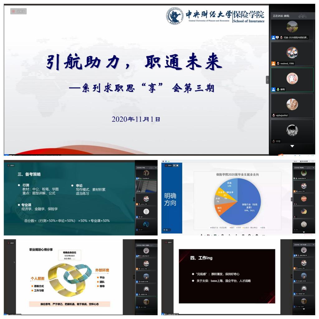 为帮助新葡萄8883官网AMG官网研究生同学进一步明确未来职业规划方向,了解不同机构的工作范畴和工作情况,新葡萄8883官网AMG官网展开“引航助力,职通未来”求职思“享”会,邀请就职于大型保险公司、银保监会等优秀毕业生分享求职经验。受疫情影响,该系列分享会均采取线上方式进行。该系列求职经验分享会进一步加深了研究生新生对未来求职方向的明确认识,帮助同学们有效地进行职业规划,提升自身的综合能力,合理调整求职心态,提升在日后求职中的综合竞争力。
