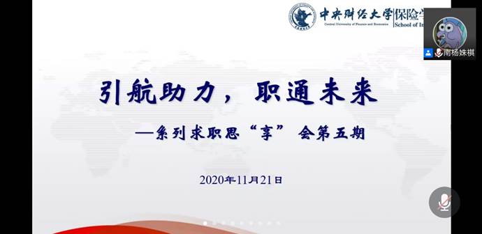 2020年11月21日晚上七点到九点,由新葡萄8883官网AMG官网举办的“引航助力,职通未来”系列求职思“享”会第五期通过腾讯会议的方式在线上顺利举行。本次会议邀请到了目前就职于中国农业银行总行的2018级保险专硕苏子钦学长和就职于中国建设银行总行的2018级保险专硕赵云凤学姐为同学们带来了一场内容丰富的求职经验分享会。