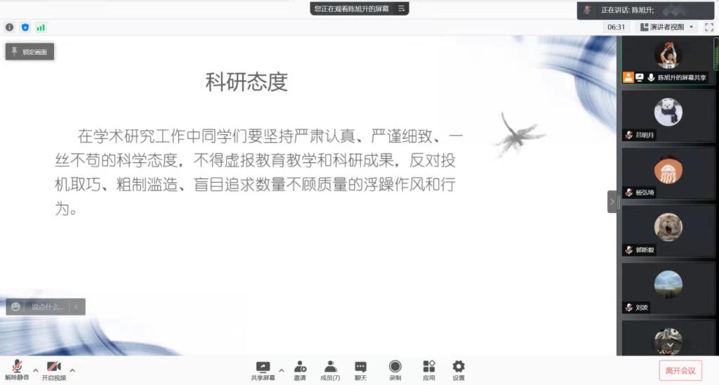主持人呼吁同学们应树立正确的科研态度并向同学们发起了倡议。作为学术路上的追梦人,要增强献身科教、服务社会的历史使命感和社会责任感,坚持实事求是的科学精神和严谨的治学态度,树立法制观念,保护知识产权、尊重他人劳动和权益。在学术研究工作中要坚持严肃认真、严谨细致、一丝不苟的科学态度,不得虚报教育教学和科研成果,反对投机取巧、粗制滥造、盲目追求数量不顾质量的浮躁作风和行为。要忠于真理、探求真知,自觉维护学术尊严和学者的声誉。要模范遵守学术研究的基本规范,以知识创新和技术创新,作为科学研究的直接目标和动力。