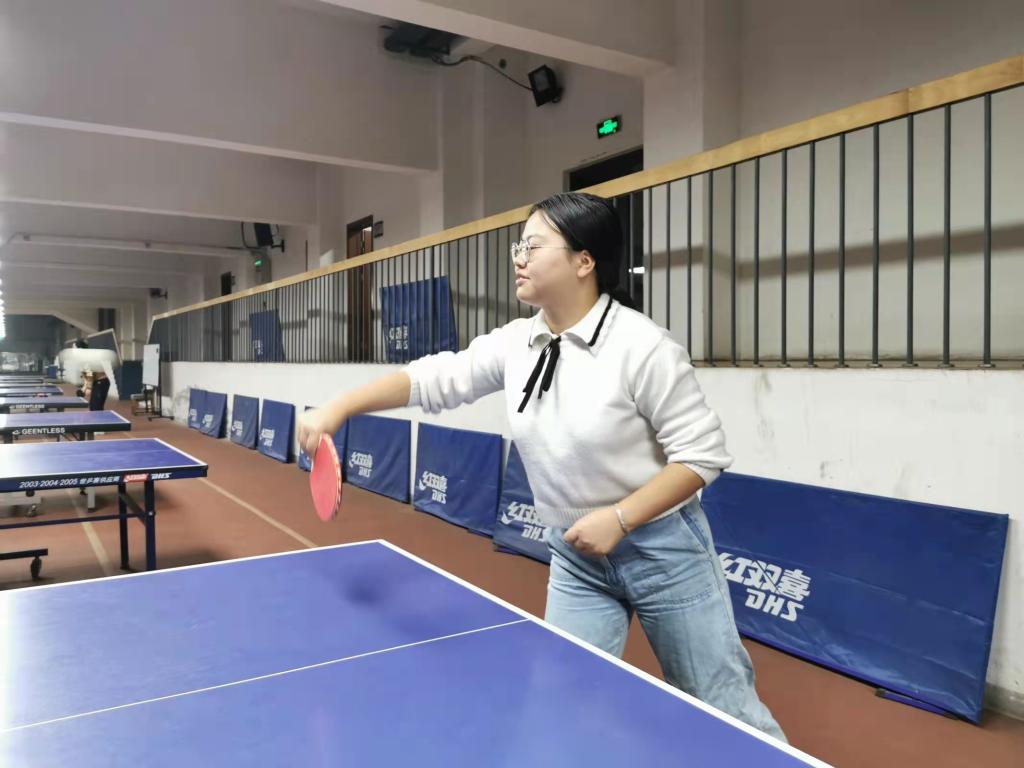11月18日,球员们在沙河校区体育馆进行了激烈的竞技赛决赛。在最终的一轮比拼中,张秋香以独特的发球技巧,使李馨连连失分,在观众席的阵阵躁动中,李馨找到了破解的方法,以拿手的侧旋球来接球,打得张秋香措手不及。双方你来我往,最终在张秋香的一记扣杀中结束了比赛,张秋香同学成为“2021社保研乒乓之星”。
