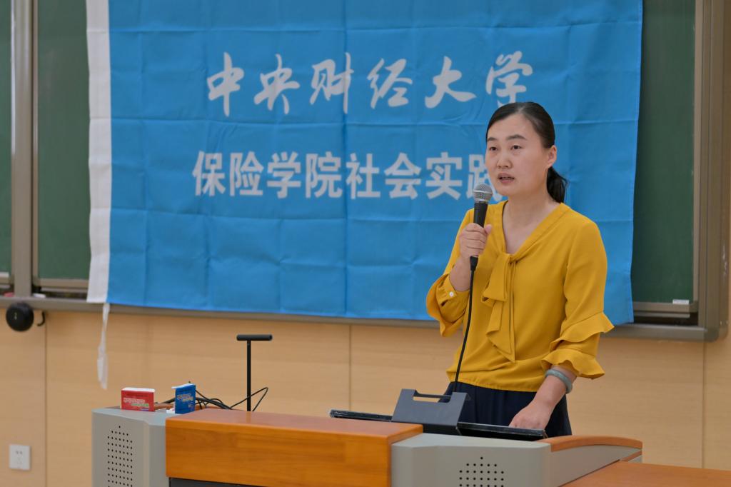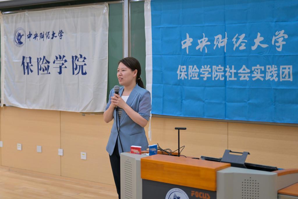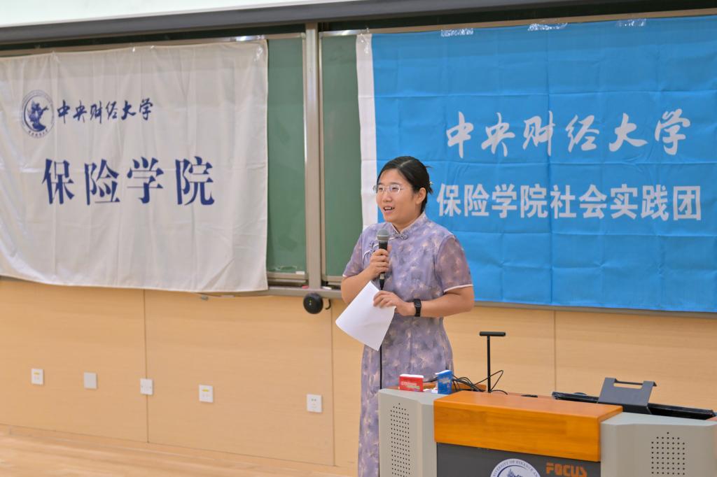 接下来吴蓓老师进行发言。她希望广大保险学子在暑期社会实践中主动宣传贯彻党的二十大精神,深入领会落实习近平总书记关于青年工作的重要思想,用习近平新时代中国特色社会主义思想凝心铸魂。在深入调查研究之中,切身感受保险行业发展,将所学知识与经济社会发展紧密结合,亲身参加行业观察、业务实践、特色交流、分享宣传等实践活动,深入了解国情社情,提升综合素质,用实际行动在以中国式现代化推进中华民族伟大复兴的使命任务中贡献青春力量。