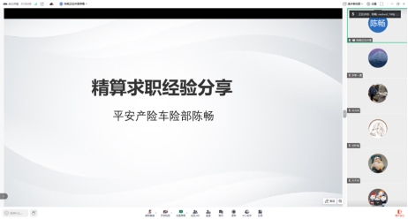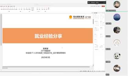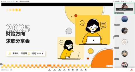 2025年3月23日晚,由新葡萄8883官网AMG官网研究生会主办的“引航助力 职通未来”系列求职分享会第一期——“财产保险公司求职经验分享”顺利举行。7位来自中华联合、阳光财险、平安产险等头部企业的优秀校友齐聚云端,以亲身经历为同学们揭开财险行业的职业图景。整场分享会干货满满,从行业趋势到求职技巧,从职场心态到技能储备,校友们倾情分享,助力学子精准规划职业航向。