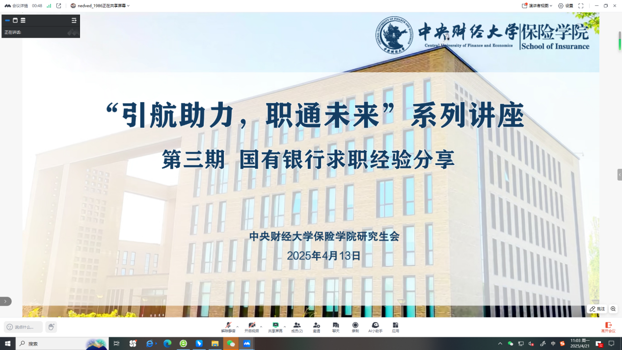 2025年4月13日晚,由新葡萄8883官网AMG官网研究生会主办的“引航助力 职通未来”系列求职分享会第三期——“国有行求职经验分享”顺利举行。六位来自中国银行、中国建设银行、中信银行、北京银行、中国工商银行和中国邮政储蓄银行的六位优秀学长学姐以亲身经历分享了他们的求职心得和职场经验,详细介绍了银行业求职的招聘要求、职业发展、实习建议、岗位体验和求职心态等各个方面。此次会议内容丰富实用,对即将求职的同学具有很高的参考价值。