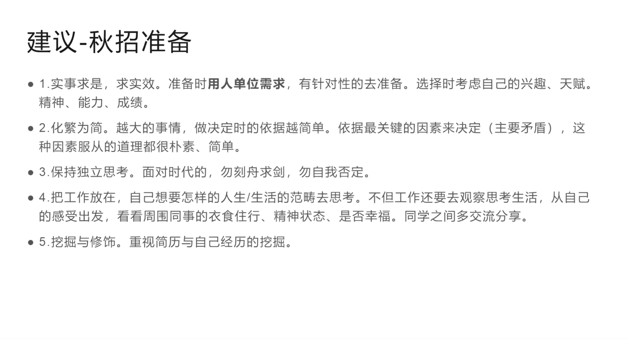 张天源分享了自己在秋招过程中的经验和心得。他强调了求职过程中要实事求是,了解用人单位需求,并有针对性地做好准备。他建议同学们在实习过程中多尝试,通过实践发现自己的兴趣和天赋。张天源同时提到,秋招的成功不仅依赖于成绩和奖项,更重要的是展示自己的能力和内在精神。他鼓励大家保持乐观心态,面对时代压力,做好自己的事,不要过于自我否定,无论面对怎样的环境,都要有能够创造幸福的信念。