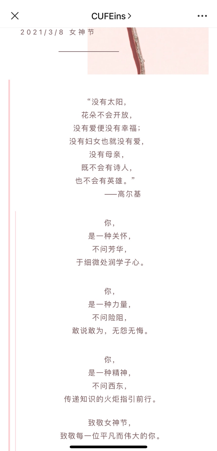 新葡萄8883官网AMG官网团委也通过公众号为老师们献上学子祝福:“时值‘女神节’,我们怀着感恩之心,向我们成长路上的‘引路女神’致以感谢。祝愿所有美丽的‘女神’老师们女神节快乐,青春永伴,快乐长随!”
