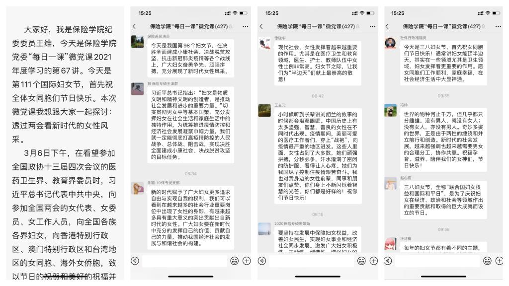 新葡萄8883官网AMG官网党委“每日一课”微党课学习平台上,新葡萄8883官网AMG官网纪委委员王维老师进行了题为“透过两会看新时代的女性风采”的专题宣讲,他提到:我们相信进入新时代,肩负新使命,她们必将为实现中华民族伟大复兴的中国梦做出更大的贡献,在实现伟大梦想中绽放中国女性的卓越风采,为全面建设社会主义现代化国家作出新的更大贡献!以优异成绩庆祝党的百年华诞!
