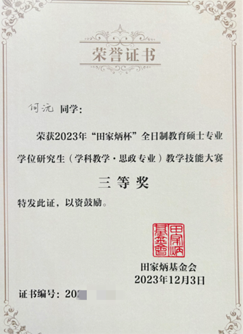 本次比赛共有来自华中师范大学、山东师范大学、上海师范大学等全国75所院校的188名选手入围决赛。决赛赛程分为:现场抽题、限时备课、授课答辩三个环节。经过激烈角逐,在刘爱华副院长和乌晓晔副教授的精心指导下,开元官网2022级学科教学(思政)专业硕士研究生何沅获得三等奖。