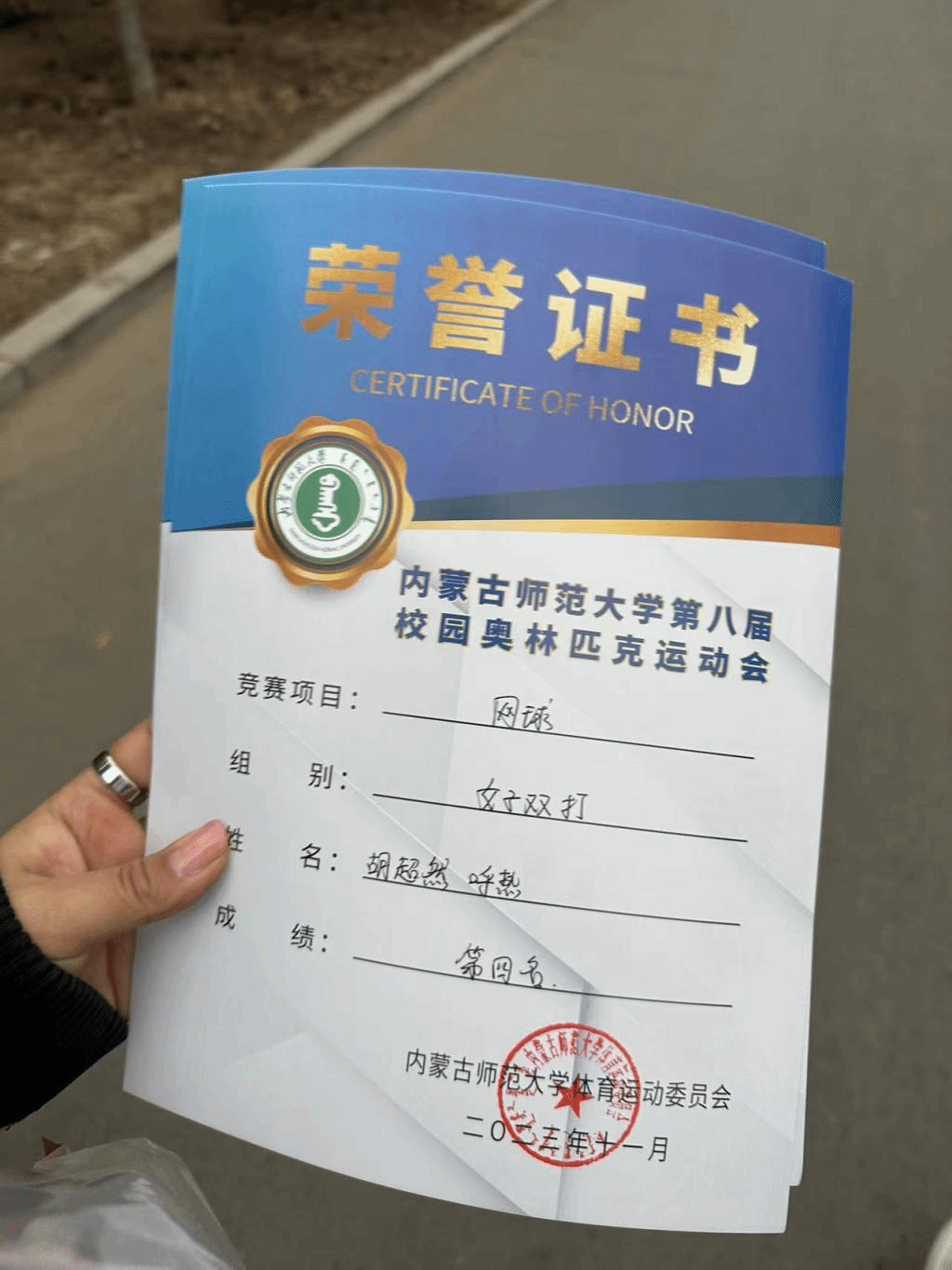 我班胡超然同学在ky开元集团官网第八届奥林匹克运动会网球女子双打中获得第四名