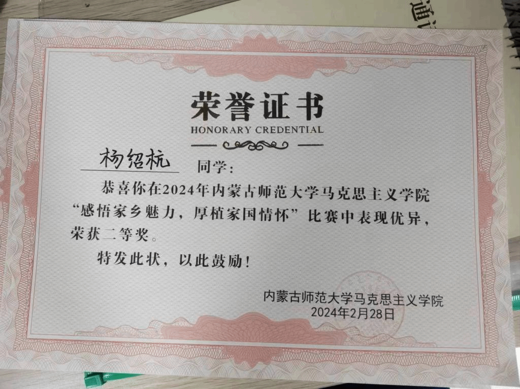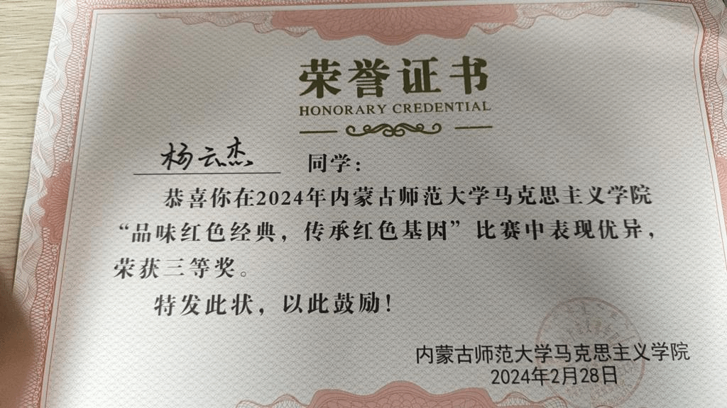 我班杨云杰同学在ky开元集团官网“品味红色经典,传承红色基因”比赛中获得三等奖,杨绍杭同学获得二等奖。