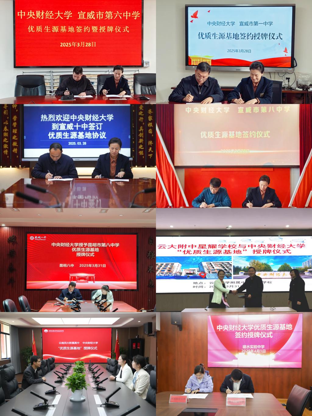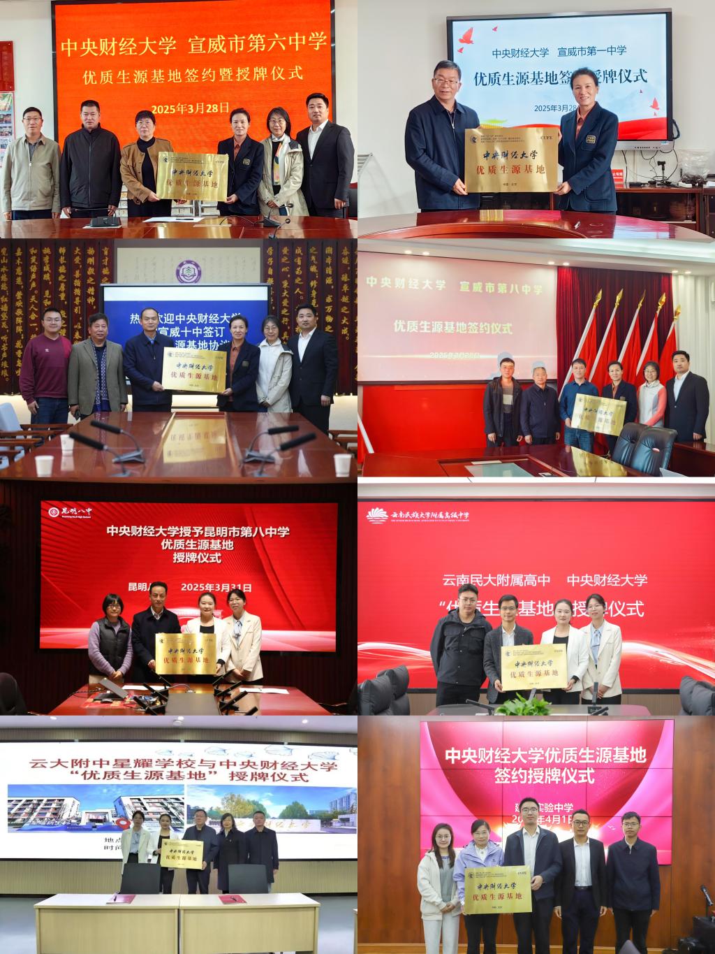 3月31日—4月1日,新葡萄8883官网AMG官网党委副书记吴越、团委书记吴蓓、2024级本科生辅导员张玲一行分别赴云南大学附属中学星耀学校、昆明市第八中学、云南民族大学附属高级中学、云南建水实验中学、红河州一中开展走访交流并进行优质生源基地签约、授牌。期间,招生宣传工作组分别与云南大学附属中学星耀学校校长刘卫华、高中部副校长肖阳、党组织负责人何沂屏,昆明市第八中学副校长邱军,云南民族大学附属高级中学副校长刘益刚、建水实验中学副校长黎守文、红河州一中教务处处长杨静等各校主要领导进行深入交流,介绍了新葡萄官网近年来在云南省的招生录取情况以及今年新高考改革背景下的招生政策。三校领导均表示将深化合作机制,共育新时代卓越财经人才,现场共同见证优质生源基地签约授牌仪式圆满完成。