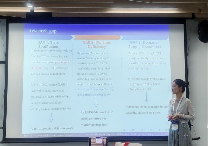 林书齐同学在“长期护理”分会场上汇报了与导师李晓林教授合作的研究成果“Research on the Identification of Demand Factors and Hierarchical Prediction for Long-Term Care Services in China Using Deep Learning”。她采用中国健康与养老追踪调查(CHARLS)和中国老年健康影响因素跟踪调查数据库(CLHLS),利用XGBoost筛选关键风险因子,并针对所提取的主要因子进行聚类分析,在健康风险、经济风险和社会风险三个维度进行风险分层,而后利用LSTM-Markov模型捕捉非马尔可夫性计算失能状态转移概率。她采取mlogit模型,通过分层特定连接矩阵,将失能状态转化为护理强度、成本等需求指标,耦合客观风险与主观选择,对不同风险群体的长期护理保险需求进行测算,并预测了未来10年护理保险参保需求。