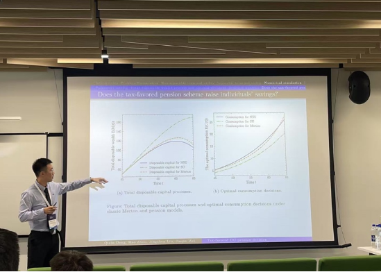 7月2日,邓启鑫同学在“养老金与退休计划I”分会场上分享了他与导师刘敬真教授的研究成果“Optimal investment-consumption and tax-favored private defined-contribution pension decision”。该研究聚焦含税收优惠的个人定额缴款养老金计划下的最优投资消费问题。研究通过引入基于工资收入的税收函数,分析税收激励对养老金缴款决策的影响,并在常相对风险厌恶效用下获得解析解。其研究发现,养老金计划参与者将常规账户与养老金账户视为单一整体或独立账户的认知差异,对消费与养老金缴款决策影响显著。