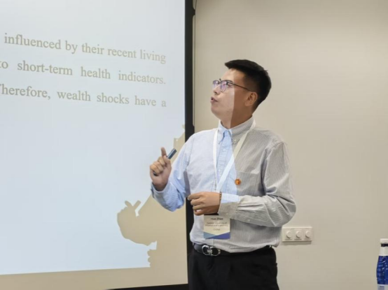 7月3日,赵桦同学在“长期护理”分会场上汇报了与导师周桦教授合作的研究成果“The impact of wealth shocks on elderly health: Evidence from the China Health and Retirement Longitudinal Study”。他利用2011-2018年中国健康与养老追踪调查(CHARLS)面板数据,系统考察了财富冲击对老年人健康的影响。结果显示:财富冲击对老年人自评健康和心理健康无显著统计学影响,但对客观身体健康影响显著,且该结论在多项敏感性分析中保持稳健。机制分析表明,医疗服务可及性提升和生活习惯改变是财富冲击影响身体健康的中介路径。异质性分析进一步发现,财富冲击对客观身体健康的影响在参保人群、女性、低龄老年人(60-74岁)及居住在一线、新一线和二线城市的群体中表现最为突出。