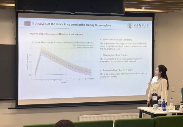 燕令葭同学在“保险经济学与市场行为”分会场分享了与导师周桦教授合作的研究成果“Research on the Stock Price Differences of Cross-listed Companies——Taking China Life A+H+N Shares as An Example”。她以中国人寿A股、H股和N股为例,探讨了交叉上市公司的股价差异。她使用EEMD算法将股价分解成不同时间尺度的数据,利用VAR模型和GARCH族分别研究高频分量和低频分量在三地股市间的内部联动性,并探究了外部事件对于三地股价的冲击,结合ICSS变点,分析各个分量中变点产生的原因以及不同市场间变点的差异,用以进一步解释三地市场的信息分割情况,探究了中国人寿从美股退市这一特殊事件对另外两地股市的影响。
