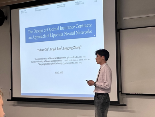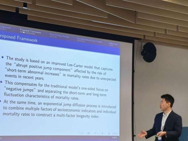 7月4日,续一天同学在“养老金与退休计划II”分会场上汇报了与导师周桦教授合作的研究“Longevity Bond Pricing in Pension with Positive Jumps”。他聚焦于全球老龄化背景下的养老金缺口和长寿风险管理挑战,创新性地结合跳跃扩散过程,构建了一个包含正向跳跃成分和长寿指数的动态框架。该框架的关键在于对Lee-Carter模型进行了重要改进,引入了正向跳跃因子以捕捉短期死亡冲击,并构建了多因子长寿指数来分离长期趋势与短期波动。基于此框架,他运用风险中性估值原理,研究了在非完全市场环境下长寿债券的一致定价方案,进一步提升了长寿风险对冲的理论基础。