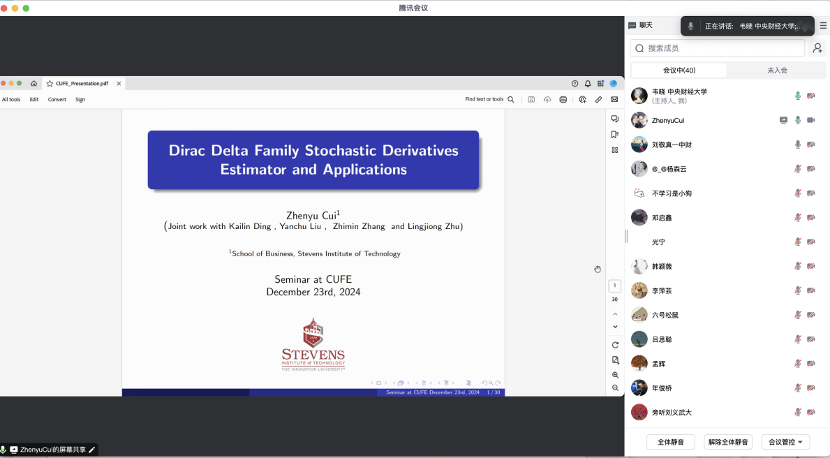 2024年12月23日上午,中国精算研究院通过腾讯会议线上成功举办了第255期精算论坛。本次论坛邀请了斯蒂文斯理工学院商学院的崔振嵛副教授作为主讲嘉宾,为与会师生带来了题为“Dirac Delta Family Stochastic Derivative Estimator and Applications”的学术报告。活动由中国精算研究院韦晓老师主持,与会师生40人。