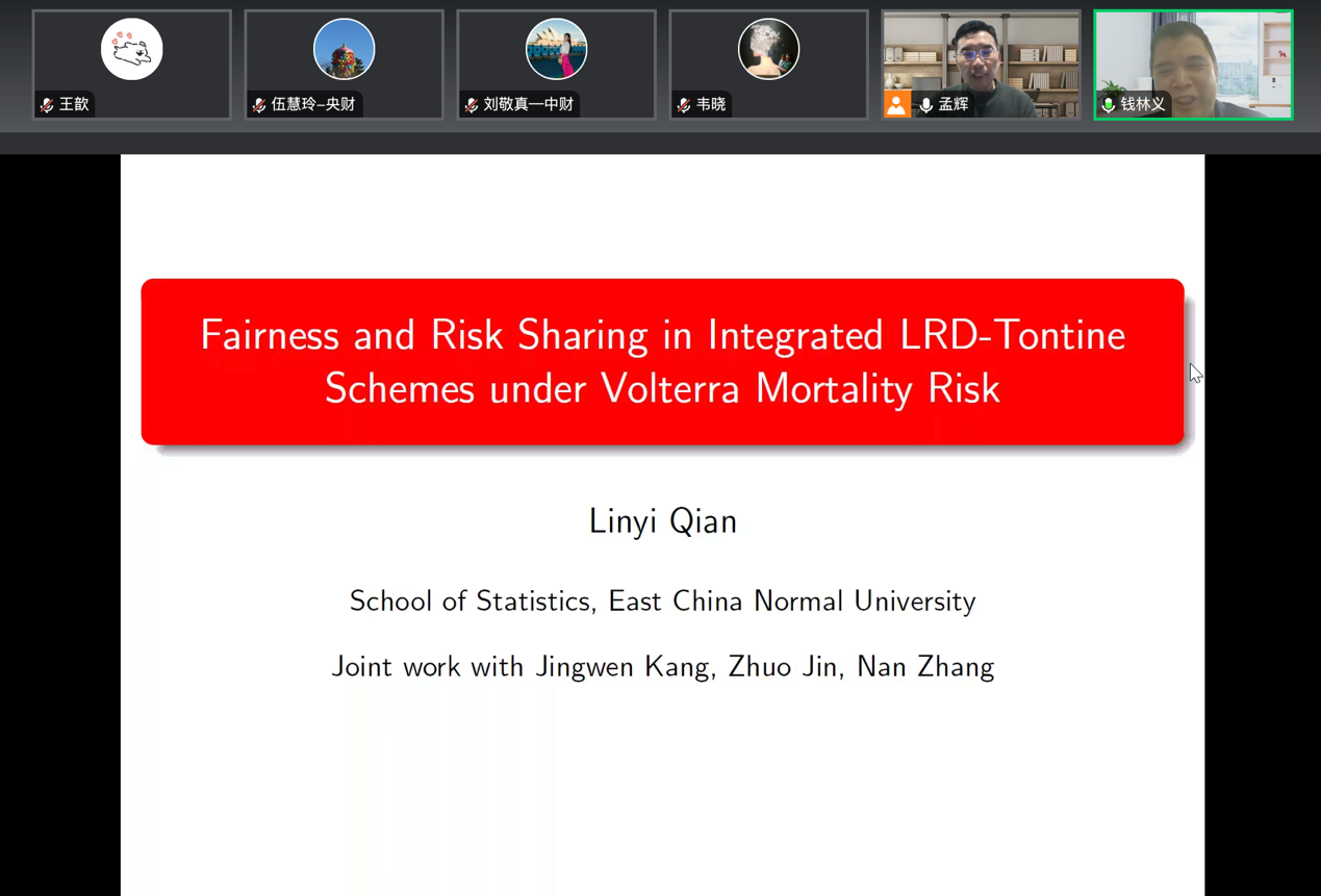 2024年12月13日上午,新葡萄官网以线上形式成功举办了精算论坛第252期讲座。华东师范大学统计学院的钱林义教授应邀出席,并为与会师生带来了题为“Fairness and Risk Sharing in Integrated LRD-Tontine Schemes under Volterra Mortality”的精彩学术报告。本次讲座由新葡萄官网孟辉老师主持,与会30余人。钱林义教授现任华东师范大学统计学院院长助理、保险与精算系主任,是中国准精算师,在概率统计与保险精算领域造诣深厚,曾多次获得国家和省部级学术奖项,并在国内外权威期刊上发表多篇重要学术论文,广受学界认可。