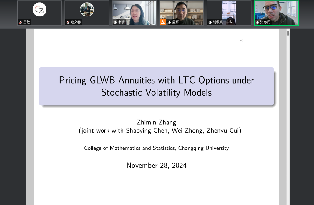 为促进金融与精算领域的学术交流,重庆大学张志民教授应邀于2024年11月29日线上为新葡萄官网师生作了题为“GLWB年金定价中的长期护理选项与随机波动率框架”的精彩学术报告。张志民教授现为重庆大学教授、博士生导师,重庆市学术技术带头人,曾赴香港大学与墨尔本大学进行学术访问。他目前担任中国工业与应用数学学会理事、中国现场统计研究会风险管理与精算分会常务理事等职务,在金融统计、金融数学、风险管理与精算学、统计学习和机器学习领域发表高水平论文80余篇。