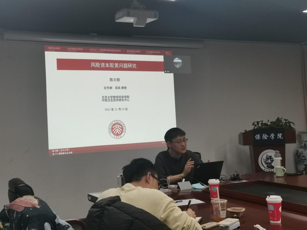 2023年12月10日下午,应中国精算研究院徐景峰教授和廖朴副教授邀请,安永咨询的胡盼女士、北京大学陈尔默博士、贵州财经大学的贺晔平副教授、河北工业大学的郑渊韬,在新葡萄8883官网AMG官网沙河校区13号楼215会议室给学院师生作了精彩的学术报告。郑苏晋教授、徐景峰教授、廖朴副教授等30余名本科生、研究生参加论坛、聆听报告。