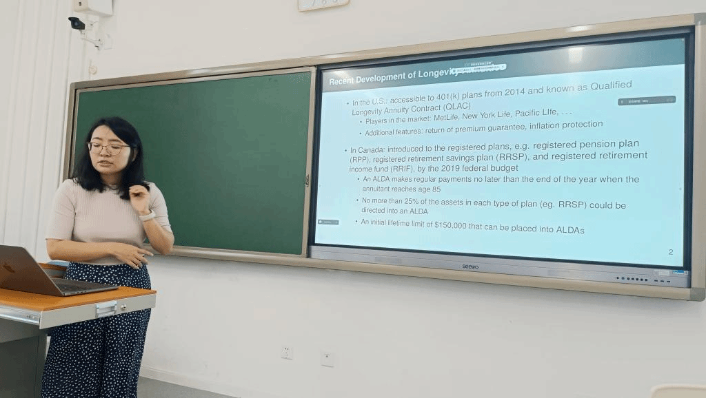 2023年7月12日上午,墨尔本大学精算科学系周瑞副教授应邀在新葡萄8883官网AMG官网沙河校区二教109教室为新葡萄8883官网AMG官网师生作了一场题为《The Role of Longevity Annuities in Different Socioeconomic Classes: A Canadian Perspective》的精彩学术报告。本次报告在考虑现实的税收退休制度以及未来寿命不确定性的框架下,探讨了不同经济阶层的加拿大人购买长寿年金对其退休收入的影响。