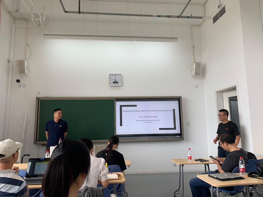 最后,郑家昆老师做了题为“Uncovering correlation sensitivity in decision making under risk”的报告。他们通过实验研究了风险下决策的相关性敏感性。在相关性敏感偏好的一般框架内,决策者可以根据其对组内回报差异的敏感性分为三类:日益敏感或逐渐敏感,或相关性不敏感。他们提出了一种新的实验任务对实验对象进行这种分类。在一系列实验中,他们发现,总体选择对组内回报差异的敏感性适度降低,得到了遗憾和显著性理论相反的结论。