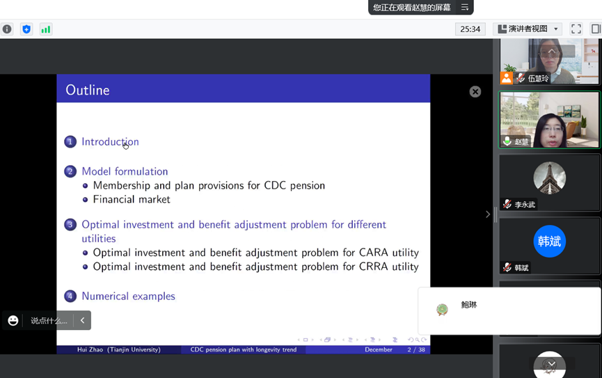 赵慧博士的报告题目是“Optimal investment and benefit adjustment problem for a collective DC pension plan with longevity trend under CEV model”。赵老师在报告里介绍了集体养老计划的运行机制,在考虑长寿风险、人口出生率低下以及股票价格过程服从CEV过程下,研究了最优投资和给付调整问题。报告通过随机控制方法在CRRA和CARA效用下得到了投资策略和最优给付的表达式,并分析了长寿指标、风险厌恶系数、CEV模型的参数对投资和累计给付的影响。
